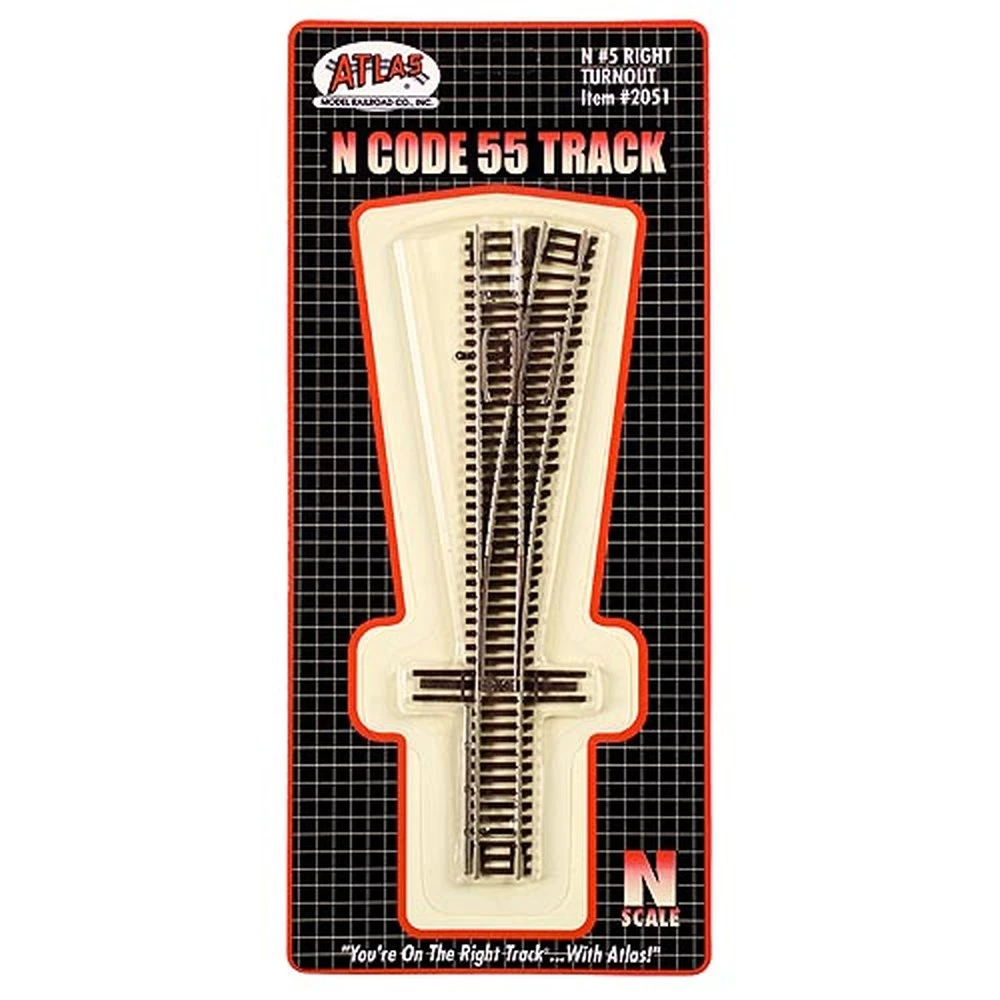 Atlas N Scale Code 55 No. 5 Turnouts feature nickel-silver rail with molded brown ties. The turnouts have a metal frog that can be powered and a throw bar extending to both sides of the points. This track is part of the Atlas Code 55 track line and has same reliability and durability as Atlas’ Code 80 track, but with a more realistic rail and tie profile to make it look more true-to-life. Code 55 track has nickel-silver rail, finer brown ties and a smaller, more realistic rail cross section than traditional N Scale Atlas track. Code 55 Snap Track is part of the Atlas N Scale Code 80 and Code 55 track line.