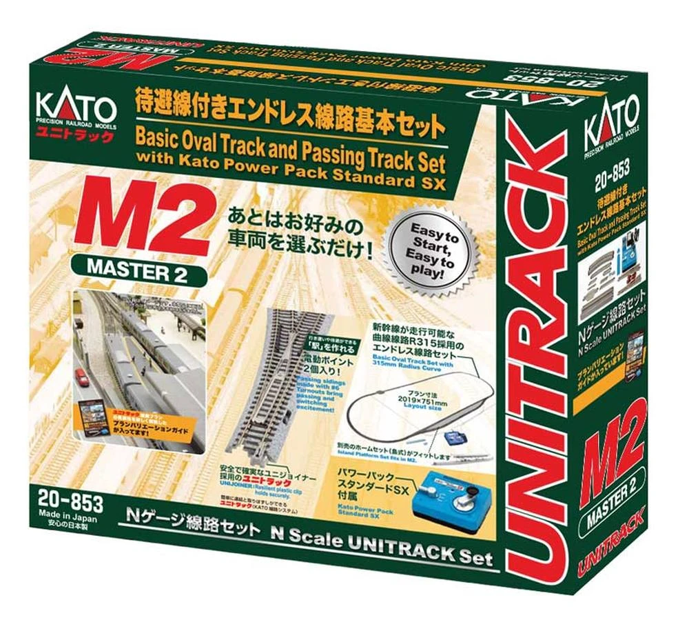 The Kato N Scale Unitrack M2 Basic Oval and Passing Track Set with Power Pack is a great way to start with the Unitrack system of roadbed-style track, The set includes a 79-1/2 x 29-9/16″ 201.9 x 75.1cm oval complete with one each right and left hand remote-control turnouts and track for a passing siding. 12-3/8″ 31.5cm radius curves allow you to use almost all available N Scale freight and passenger equipment without modifications because of curvature. Durable Unitrack features Code 80 nickel silver rail, realistic molded roadbed for setup on any surface, strudy rail joiners (Unijoiners) which provide secure connections and electrical continuity. Also included is a Kato SX power pack with wires, turnout controllers, Unijoiner remover and a rerailer. The M2 Basic Oval and Passing Track Set is easily expanded with additional Kato N Scale Unitrack sets and sections.